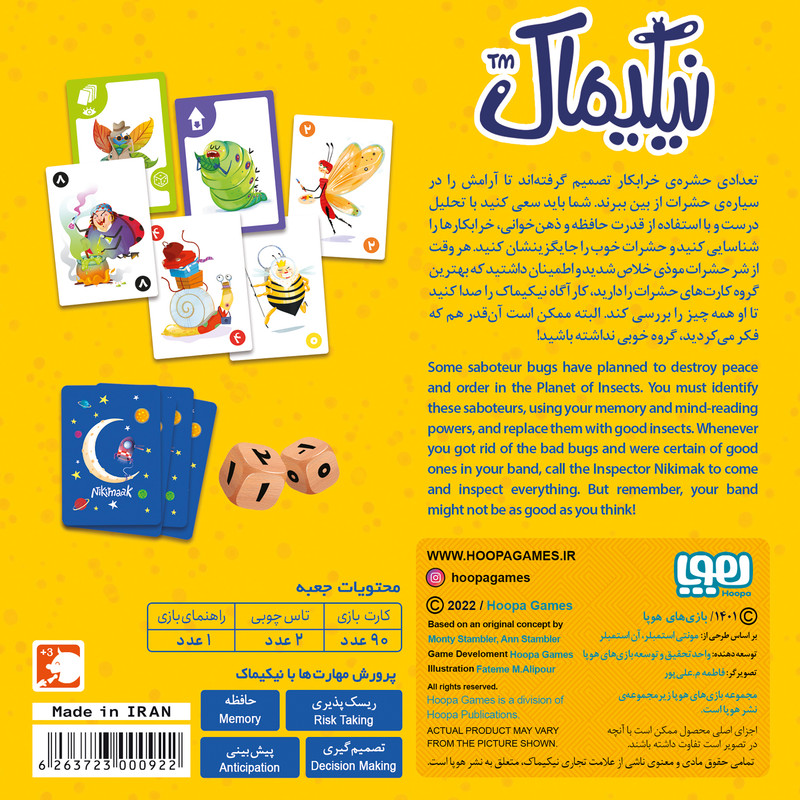 تعدادی حشرهی خرابکار تصمیم گرفتهاند تا آرامش را در سیارهی حشرات از بین ببرند. شما باید سعی کنید با تحلیل درست و با استفاده از قدرت حافظه و ذهنخوانی، خرابکارها را شناسایی کنید و حشرات خوب را جایگزینشان کنید. هروقت از شر حشرات موذی خلاص شدید و اطمینان داشتید که بهترین گروه کارتهای حشرات را دارید، کارآگاه نیکیماک را صدا کنید تا او همهچیز را بررسی کند. البته ممکن است آنقدر هم که فکر میکردید، گروه خوبی نداشته باشید! بازی نیکیماک در سال 1393 بر اساس ایدهی بازی Rat a Tat Cat توسط واحد تحقیق و توسعهی هوپا بازطراحی و پس از بررسی برخی از قوانین تغییر و به روزرسانی و نهایتا منتشر شد. ویژگی بارز این بازی استفاده از اعداد و اعمال ریاضی در جهت بهکارگیری حافظه، ریسکپذیری و تصمیمگیری میباشد.