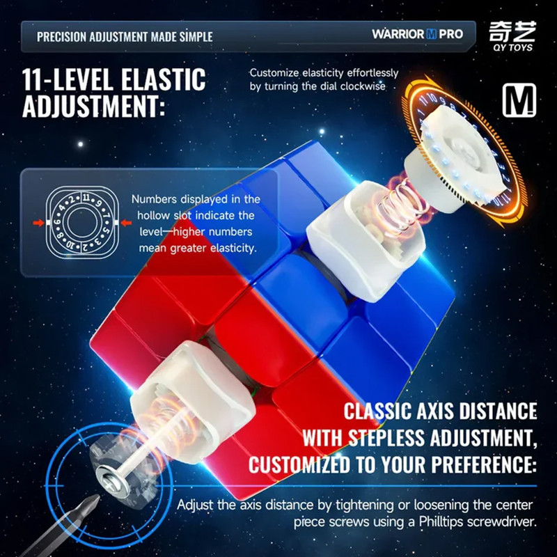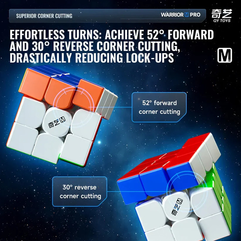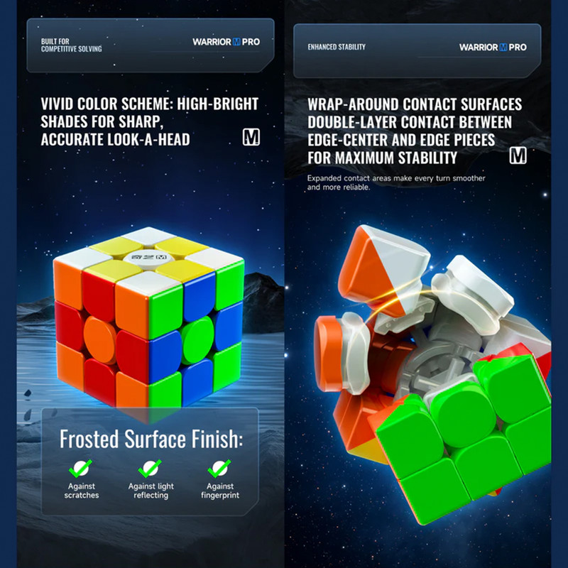 Qiyi Warrior M Pro از نظر مکانیزم داخلی، بسیار روان و سازگار با دست طراحی شده است. طراحی ضد گیرکردن (anti-pop) و قابلیت برش گوشه بسیار مناسب، باعث میشود حتی اگر مبتدی هستید، حرکات روانتری تجربه کنید و هنگام تمرین، کمتر دچار توقف و اذیت شوید. همین تعادل بین سرعت و کنترل باعث شده این مدل در میان روبیکبازان به عنوان یکی از بهترین انتخابها برای شروع اسپیدکیوبینگ شناخته شود.