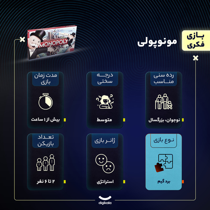 بازی فکری «Monopoly» یک منو پولی باکیفیت است که برای کودکان بالای 8 سال طراحی شده است. این بازی که از دو کلمه منو به معنای تنها و پولی به معنای فروش تشکیل شده، به بچهها کمک میکند که بتوانند خریدوفروش کرده یا محاسبه کنند که در کجا سرمایهگذاری کرده و کجا سود میکنند. طی این بازی که بهصورت گروهی (6-2) صورت میگیرد، بچهها باید تلاش کنند خانههای خاص را در زمینبازی تصاحب کرده یا اجاره کنند. هر بازیکن با استفاده از تاس و کارتهای بازی، شانسهایی را به دست میآورد تا بتواند پول و خانههای بیشتری را تصاحب کند. این بازی باعث نزدیکی افراد خانواده میشود؛ میتوانید در کنار یکدیگر بنشینید و ساعتها بازی کنید و لذت ببرید.