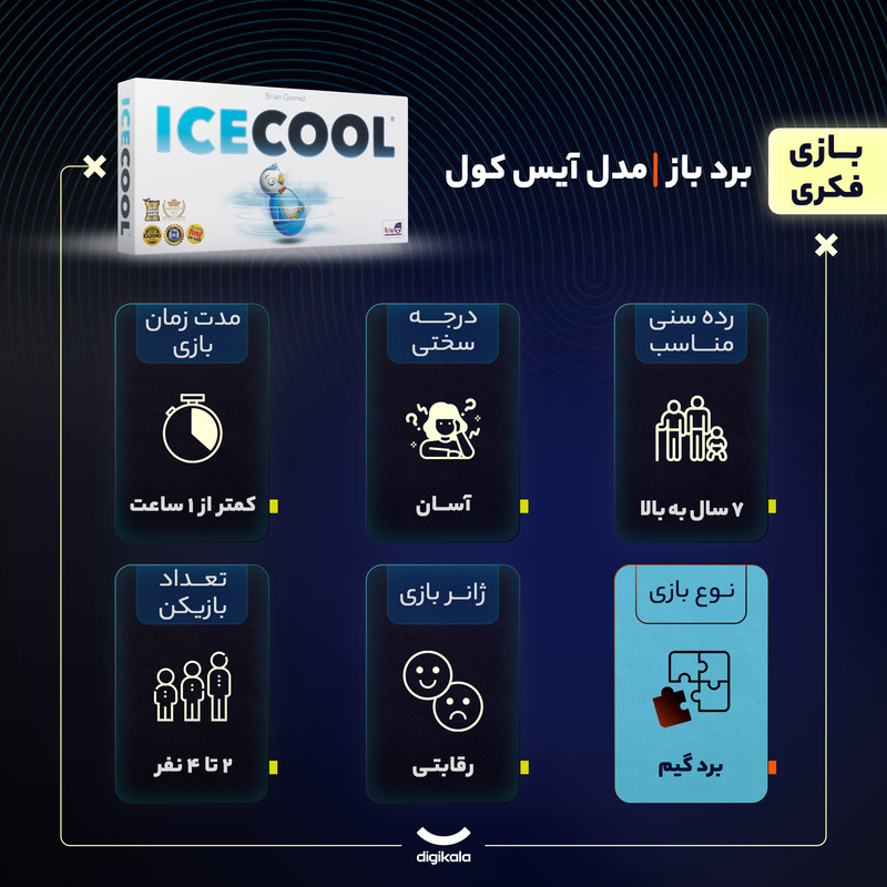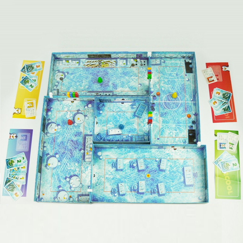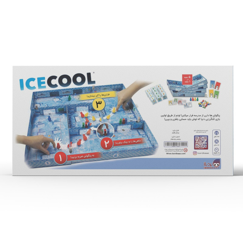 بازی رومیزی ICECOOL، یک بازی سبک ضربه زدن است، که در آن یکی از بازیکنان در نقش مبصر مدرسه یا نگهبان و دیگران در نقش فراریها با یکدیگر رقابت میکنند. مبصر در تلاش برای دستگیری خرابکارهاست تا امتیاز کسب کند. خرابکارها نیز در تلاش برای فرار از دست مبصر و دزدیدن ماهی هستند، تا امتیاز کسب کنند. هرگاه مبصر مدرسه هر کدام از خرابکارها را حداقل یکبار دستگیر کند، یا یکی از خرابکارها از هر سه دری که داخل اتاقشان ماهی است، عبور کند، یک دور بازی به پایان میرسد. هر کدام از بازیکنان یک بار مبصر شده، و در پایان، بازیکنی که بیشترین امتیاز را روی کارتهای ماهی خود داشته باشد، برندهی بازی خواهد بود. پنگوئنها را میتوان با ضربه زدن، به یک مسیر مستقیم هدایت کرد، یا حرکت قوسیشکل به آنها داد، و یا حتی از روی دیوارها پراند! بازیکنان باید هرچه در توان دارند، و به ذهنشان میرسد را به کار گیرند، تا در این بازی جذاب و پرهیجان، بیشترین امتیاز را کسب کنند.