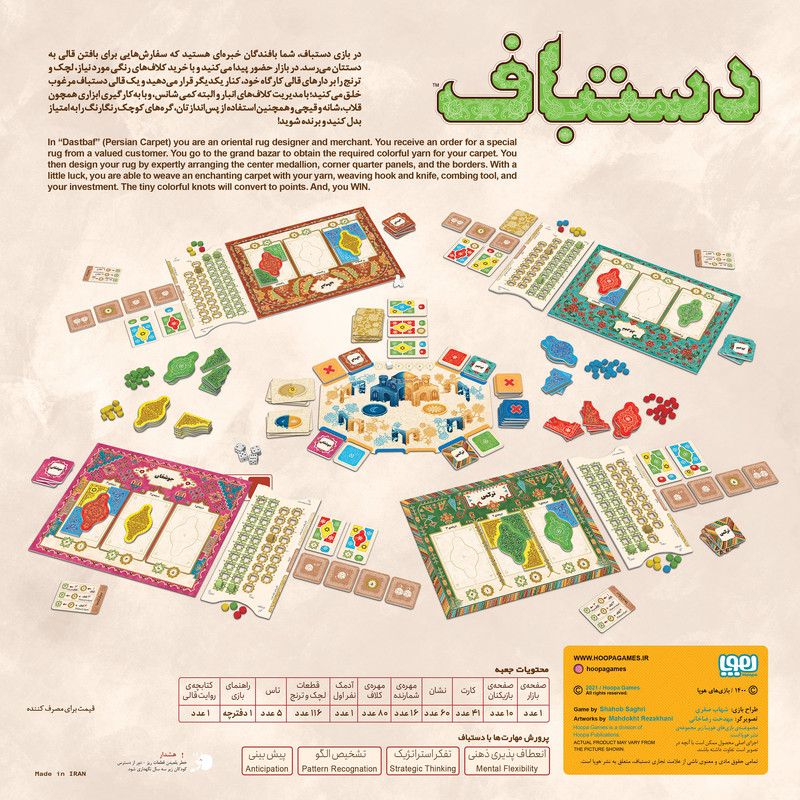 دستباف یک بازی بسیار استراتژیک، تماما ایرانی و از سری بازیهای «الف» تا «ی» ایرانی هوپا با موضوع مهم قالی بافی است. در این بازی، هر بازیکن در نقش یک قالیباف و در کارگاه قالیبافی شهر خود، مشغول به کنارهم قرار دادن نگارههای مختلف میباشد. اگر تجربه بازیهایی مانند جالیز و کاروبار که از مکانیزمهای حول محور مزایده و خرید برخوردارند برایتان دلچسب بوده و به دنبال یک بازی با موضوعی ایرانی هستید که در یک دورهمی خانوادگی به رقابت با عزیزانتان بپردازید، یا ازعلاقمندانِ بازیهای استراتژیکی هستید که ترکیبی از شانس و مهارت در بازیها برایشان خوشایند است و همچنین عواقب تصمیمها و انتخابهای لحظهای شما را به وجد میآورد، دستباف را به شما پیشنهاد میکنیم. برای انجام این بازی این جمله معروف را به خاطر بسپارید که سود واقعی در خرید مناسب است.