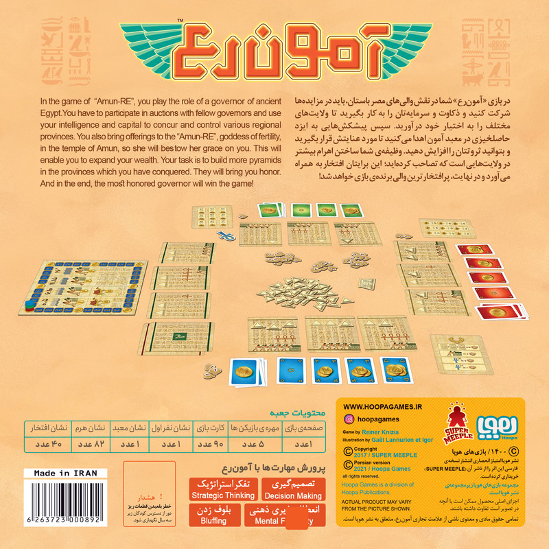 والیان مصر برای جلب رضایت ایزد حاصلخیزی (آمون) پیشکشهایی را به معبد آمون میبرند. آمون برکتی به رود نیل میبخشد که باعث افزایش رزق و روزی میشود و زمین داران میتوانند افتخار ساختن هرمهای بیشتری را ولایتهای تحت تملک خود کسب کنند. آمون رع نسخهی ایرانی بازی Amun-Re: The Card Game اثر طراح شناخته شده Reiner Knizia است. یک بازی در سبک مزایده و حراج و از سری بازیهای «بردگیم فرنگی»، با موضوعی در مورد مصر باستان. در این بازی بازیکنها در نقش والیان مصر، با منابعی که در دست دارند میتوانند در مزایدههایی شرکت کرده و ولایتهایی را به دست بیاورند. سپس با مدیریت درست منابع باید کسب درآمد کرده و در ولایتهای خود اهرامی جدید بنا کنند. در نهایت هر بازیکن با توجه به تعداد اهرام ساخته شده در ولایتهای خود افتخار کسب میکند.