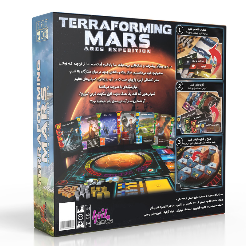 سکونت در مریخ: سفر اکتشافی آرس، بازیای است با مکانیزم ساخت موتور مولد (Engine-Building) که در آن، بازیکنان، کمپانیهای عظیم میانسیارهای را با هدف قابل سکونت (و سودآور) کردن مریخ، مدیریت میکنند. شما این کار را با هزینه کردن مگا کردیت ها (به اختصار: MCها) برای کارتهای پروژه که مستقیم یا غیرمستقیم به پروسهی زمینمانندسازی کمک میکنند، انجام خواهید داد. برای رسیدن به پیروزی، باید تا جایی که میتوانید، درجهی همانندسازی (به اختصار: TR) را بالا برده و امتیاز (به اختصار: VP) کسب کنید. بازیکنان، TR خود را با بهبود بخشیدن پارامترهای زمینی، یعنی اقیانوسها، اکسیژن و دما، بالا میبرند. TR همچنین تعیینکنندهی درآمد اصلی هر کمپانی نیز هست و در پایان بازی نیز TRها بهعنوان امتیاز مورد محاسبه قرار خواهند گرفت. امتیازات افزوده و ظرفیتها و قابلیتهای تولیدی نیز در ازای ساخت کارتهای پروژه و سایر عملیاتهای انجامشده در طول بازی، به بازیکنان اهدا میشوند.