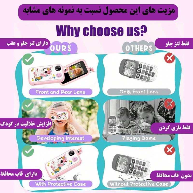 این تلفن هوشمند کودکانه با الهام از گوشیهای هوشمند واقعی طراحی شده و امکانات متنوعی را در اختیار کودکان قرار میدهد. از پخش موسیقی و گالری عکس گرفته تا چراغ قوه، ماشین حساب، تقویم، آلارم، ضبط صدا و تایمر، همه و همه در این دستگاه کوچک و دوستداشتنی گنجانده شده است. همچنین، با قابلیت انتخاب از میان چندین تصویر زمینه متنوع، کودک شما میتواند ظاهر تلفن خود را مطابق با سلیقه خود شخصیسازی کند. این محصول با طراحی زیبا و ارگونومیک، کاملاً متناسب با دستان کوچک کودکان ساخته شده و همراهی ایدهآل برای آنها در هر زمان و مکان خواهد بود.