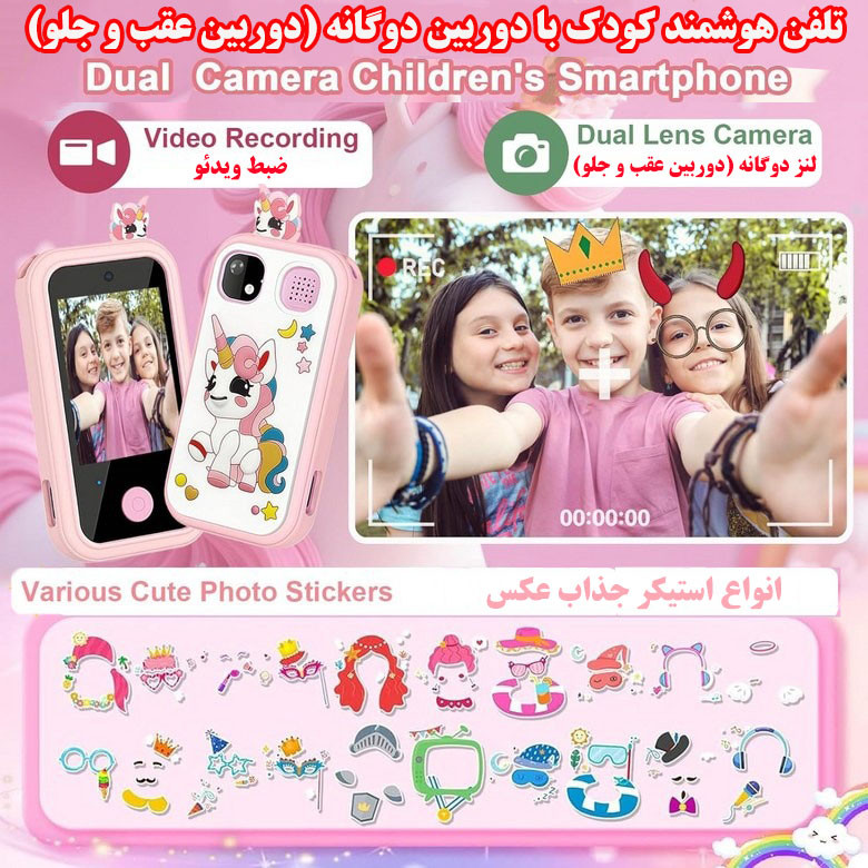 یکی از برجستهترین ویژگیهای این تلفن هوشمند، قابلیت ضبط تصاویر و ویدئوهای فوقالعاده با کیفیت 1080P HD است. به لطف دوربین دوگانه (پشت و جلو)، کودک شما میتواند هم از مناظر و دوستان خود عکاسی کند و هم سلفیهای بامزه بگیرد و به این ترتیب، خاطرات شیرین کودکیاش را برای همیشه ماندگار سازد. قابلیت زوم دیجیتال این امکان را فراهم میکند تا جزئیات بیشتری از دنیای اطرافشان را کشف و ثبت کنند. علاوه بر این، مجموعهای از استیکرهای جذاب و متنوع عکاسی، به تصاویر آنها جلوهای فانتزی و منحصربهفرد میبخشد و خلاقیتشان را شکوفا میسازد.