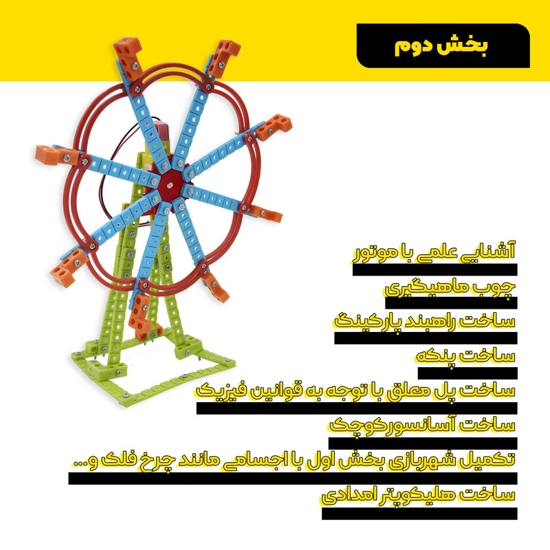 ساخت اجسام جذاب مختلف از هلیکوپتر تا چرخوفلک در این بسته آموزشی گنجانده شده است. بنابراین از مهارت آموزی و رشد فکری فرزند خود مطمئن باشید.