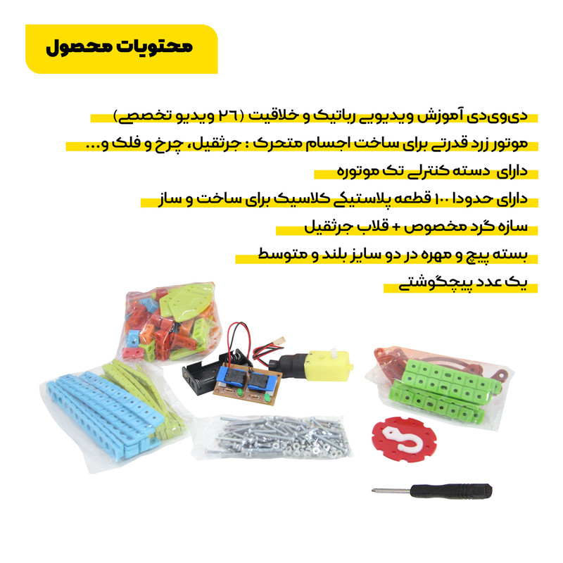پک خلاقیت و رباتیک نابغه شامل قطعات مختلفی مانند جعبهابزار ساده، پیچ و مهره، سازههای مختلف، موتور و… است که متناسب با خلاقیت کودک امکان ساخت اجسام گوناگون وجود خواهد داشت.