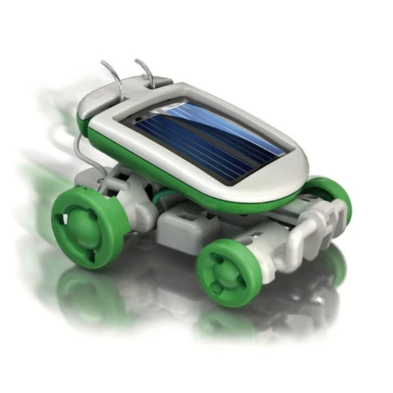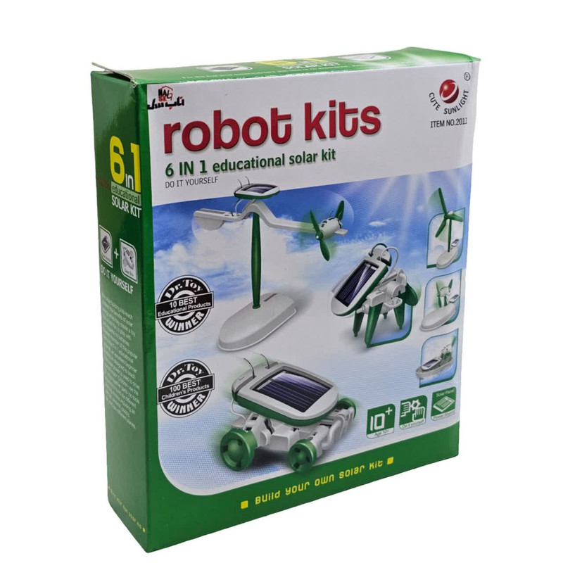 کیت ربات 6 در 1 یک ناب سل محصول بی نظیر برای آموزش فواید انرژی خورشیدی ،تبدیل انرژی روشنایی خورشیدی به جریان الکتریکی و حرکت مکانیکی با روش های سرگرم کننده است.این محصول دارای 33 قطعه شامل چرخ دنده و ماژول خورشیدی است که با اتصال آن ها به یکدیگر می توان به 6 وسیله مختلف شامل دو هواپیما، آسیاب بادی، ماشین، قایق بادی و حیوان خانگی تبدیل کرد.