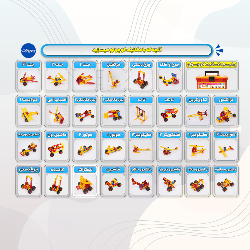 پکیج آموزش رباتیک مکانیک کوچولو از برند معروف و معتبر روبویونیک (شرکت خلاق رباتیک آروند) یک محصول سرگرمی آموزشی مناسب برای کودکان 3 الی 9 سال علاقمند به ساخت و ساز است. این کیت آموزشی به دلیل داشتن پیچ و مهره های پلاستیکی درشت و سازهای بزرگ با کیفیت امکان ساخت و ساز را برای خردسالان میسر کرده است و مورد توجه خانوادهها و خیلی از مهدکودکها و همچنین کلاسهای خلاقیت قرار گرفته است. در این مجموعه کودک میآموزد با سرهم کردن سازه ها و اتصال آنها به یکدیگر اجسام پیرامون خود را بسازد و در مراحل بعد با همین قطعات شروع به ساخت انواع ماشین و هواپیما و اجسام حرکتی کند. این محصول بدون موتورالکتریکی و دست کنترل است و برای بازی با این مجموعه نیاز به دانش فنی نیست اما اجسامی که ساخته میشوند به واسطه چرخهای متحرک قادر به حرکت هستند. کودک پس از سپری کردن این مجموعه آموزشی جذاب آمادگی و مهارت پیش نیاز برای کار با محصولات پیشرفته تر و کار با موتور الکتریکی را خواهد داشت. برای مراحل بالاتر بستههای آموزش رباتیک نابغه کوچک یا پکیج های کاملتری همچون کیت آموزش رباتیک روبوکاپ یا کیت آموزش رباتیک مدل حرفه ای (advance) روبویونیک را به شما پیشنهاد میدهیم. مکانیک کوچولو به همراه برگه راهنمای تصویری گام به گام و ویدیوهای تکمیلی جهت رفع ابهام و سهولت استفاده از این مجموعه سرگرم کننده ارسال میگردد.