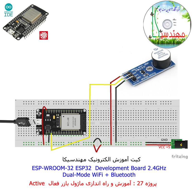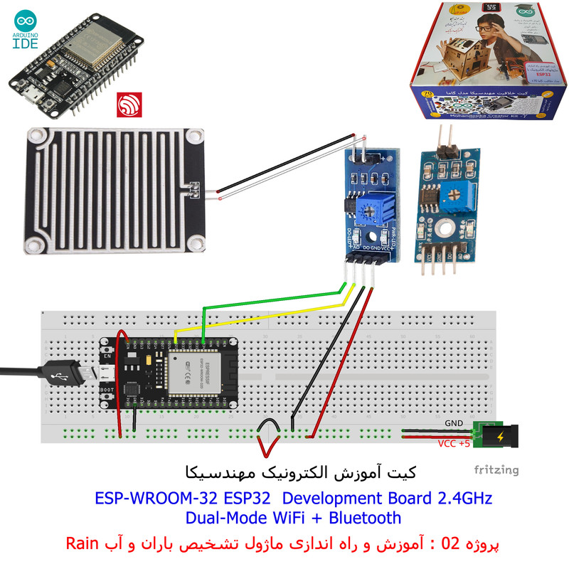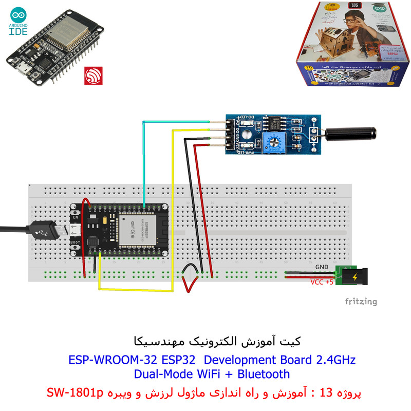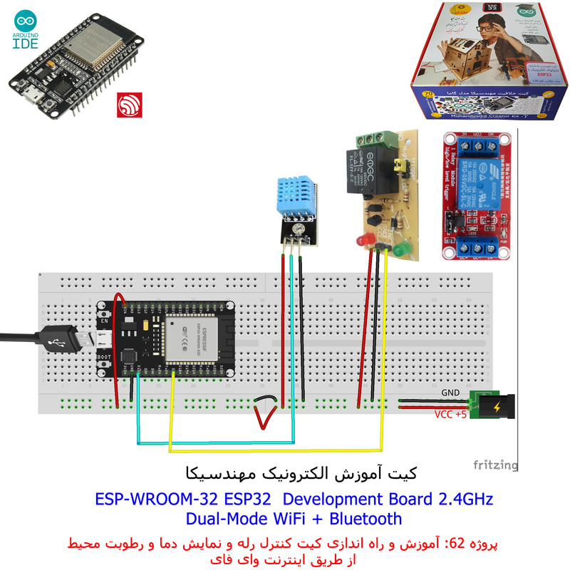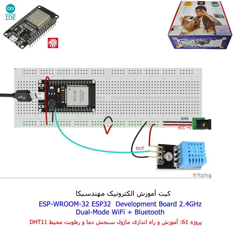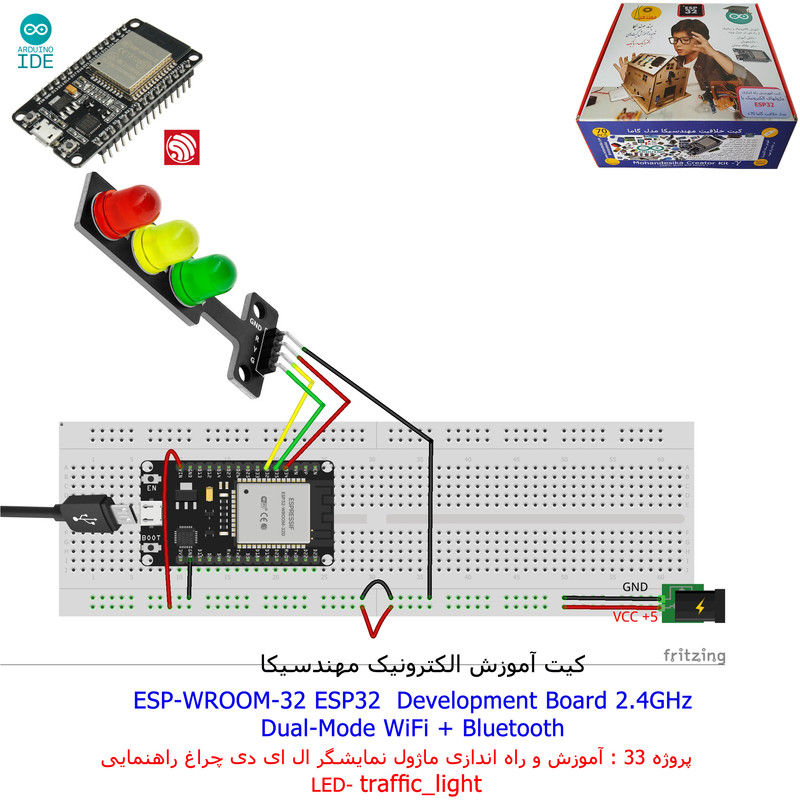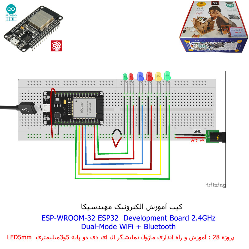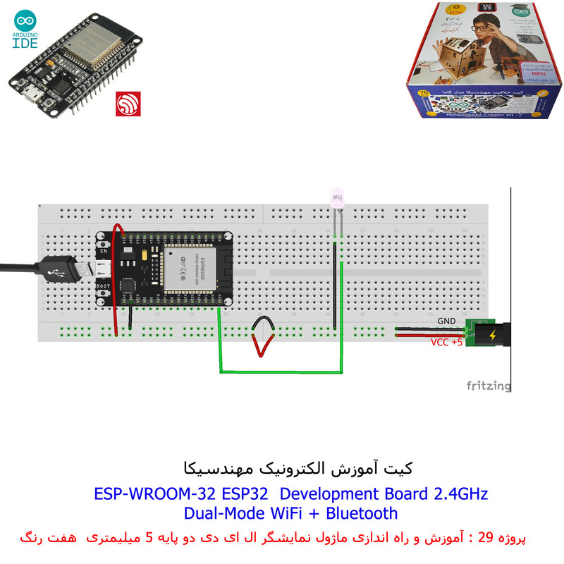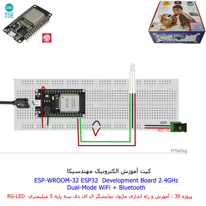 با استفاده از فایل آموزش ارائه شده قطعات وماژولها را روی برد بورد (breadboard) مونتاژ نمایید .مونتاژ برروی برد بورد (breadboard) مزایای زیادی برای کاربران دارد که در بردهای مدارچاپی امکان ندارد از جمله بازگشت و اصلاح مدار ویا استفاده از قطعات یا ماژولها در سایر طرحها و همچنین امکان مونتاژ و دمونتاژ مدار به کرات، این روش برای علاقه مندان که بصورت آزمایشگاهی مدارات مونتاژ میشوند بهترین روش آموزشی در یادگیری است. برای مونتاژ ماژول ESP32(مدل۳۰پین با مبدلCP2102)برروی بردبورد از شیلد ۳۰ پین DIP برد مهندسیکا استفاده میشود .ماژول ESP32 نسخه ی ارتقا یافته ی ESP8266 است. دارا بودن پردازنده ی قدرتمند این ماژول به همراه دو ماژول وای فای و بلوتوث و پایه های ورودی و خروجی با قابلیت های متنوع، ESP32 را گزینه ای مناسب برای استفاده در پروژه های هوشمند سازی تجهیزات (IOT) کرده است.یادگیری با فایل آموزشی و خدمات مشاوره آنلاین در سطح دانش آموزان و دانشجویان است .