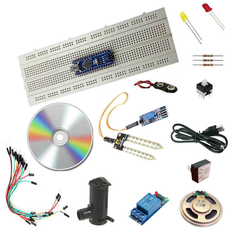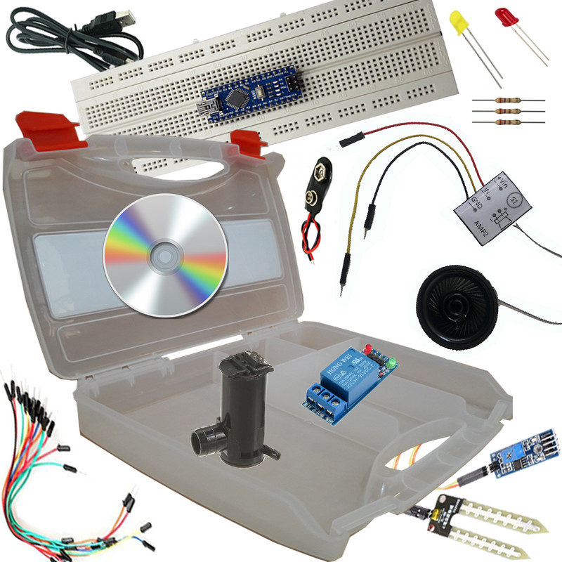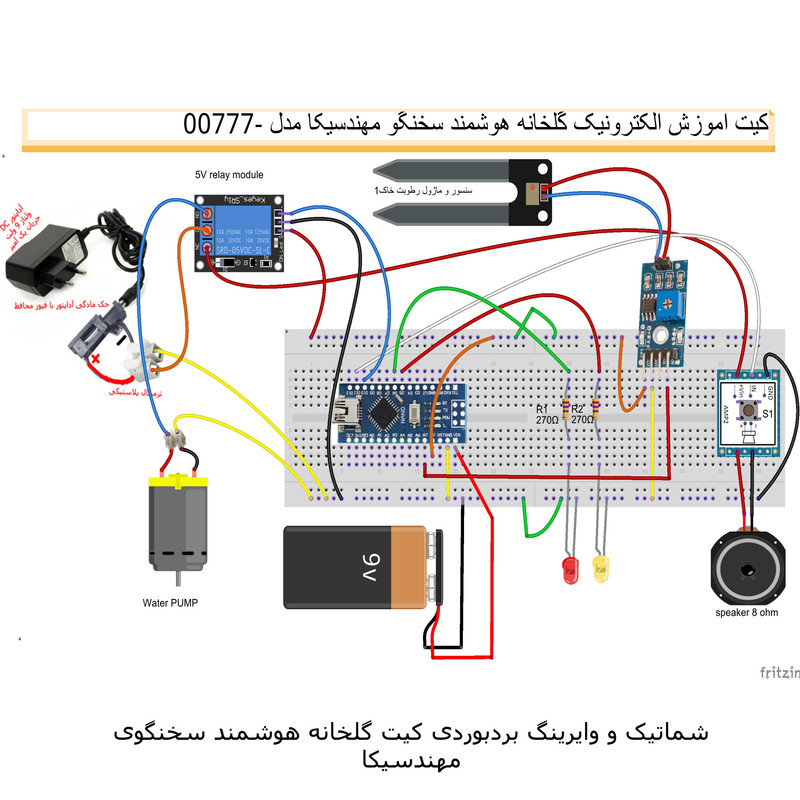 کیت آموزش الکترونیک گلخانه هوشمند سخنگو یک مدل واقعی کوچک از مکانیزم آبیاری گلها با ماژول آردوینو نانو است که بدون آنکه تخصص بالای الکترونیک داشته باشید میتوانید بسازید و از الکترونیک لذت ببرید در این کیت الکترونیکی ماژولهای لازم به صورت نمونه آزمایشگاهی به همراه DVD آموزش مالتی مدیا جهت علاقه مندان ارائه میگردد که علاوه بر سرگرمی و لذت بردن از مدارات الکترونیک کاربرد آموزشی نیز دارد . جهت ایجاد سرگرمی قابلیت پخش پیام صوتی دارد و عملکرد آن به این صورت است که گیاه نیاز خود را به آب بصورت سخنگو بیان کند و بصورت هوشمند فرمان آبیاری را به پمپ آب میدهد و پس از آبیاری، فرمان قطع آبیاری را صادر میکند. با استفاده از سنسور رطوبت خاک میزان رطوبت خاک اندازه گیری میشود . وقتی رطوبت خاک باغچه یا گلدان کم باشد دستگاه از جانب گیاه پیغام ; آب میخام ; را تکرار میکند در این مرحله فرمان لازم به پمپ آب توسط رله داده میشود پس از آبیاری خاک سنسور رطوبت، پیام لازم را به ماژول آردوینو ارسال میکند و پمپ آب قطع شده و پیام تشکر گیاه ;آخ جــون ; و عدم نیاز به آبیاری بصورت پیام; آب کافیه ; پخش خواهد شد .توجه داشته باشید در این بسته قطعات بصورت مجزا ارائه میشود و خریدار میتواند با استفاده از DVD آموزشی و فیلم ویدئویی ارائه شده قطعات وماژولها را روی برد بورد (breadboard) مونتاژ نماید لذا ارائه تصویر وعکس کیت مونتاژ شده در فروشگاه جهت راهنمایی خریداران است .مونتاژ برروی برد بورد (breadboard) مزایای زیادی برای کاربران دارد که در بردهای مدارچاپی امکان ندارد از جمله بازگشت و اصلاح مدار ویا استفاده از قطعات یا ماژولها در سایر طرحها و همچنین امکان تکرار مونتاژ و دمونتاژ مدار بهترین روش آموزشی در یادگیری است . این مجموعه علاوه بر تقویت قدرت خلاقیت فکری نوجوانان کاربردهای متنوعی برای پژوهشهای دانش آموزی و پروژه های دانشجویی و حتی کاربردهای مهندسی در طراحی گلخانه هوشمند دارد و تمام اطلاعات شماتیک مدارات و سورس کد برنامه ها نیز در اختیارتان قرار میگیرد .در اصل این کیت مدل کوچکی از یک طرح واقعی است که جهت آموزش، سرگرمی معرفی شده است .جهت راه اندازی کیت باید یکعدد باتری کتابی مرغوب ترجیحا نوع آلکالاین نیز تهیه نمایید .این کیت ارزنده بهترین هدیه سرگرمی آموزشی برای فرزندان شماست .