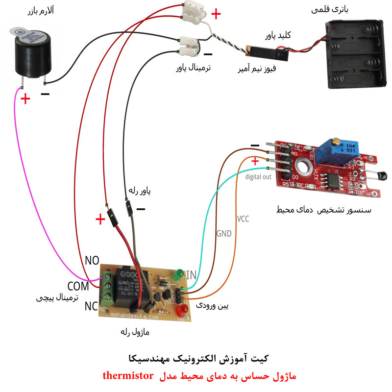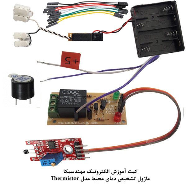 کیت آموزش الکترونیک دانش آموزی مهندسیکا یک کیت ساده سرگرمی،آموزشی است که دانش آموزان و نوجوانان را با ماژولها و مدارات الکترونیک و کنترلی آشنا میکند در این کیت هدف آشنایی و اجرای پروژهای کاربردی الکترونیکی بدون نیاز به لحیم کاری یا برنامه نویسی است .جهت انجام یک کار پژوهشی علمی و سرگرم کننده برای دانش آموزان است. ماژولهای لازم به صورت نمونه آزمایشگاهی به همراه فیلم آموزش جهت علاقه مندان ارائه میگردد که علاوه بر سرگرمی و لذت بردن از مدارات الکترونیک کاربرد آموزشی نیز دارد. ماژول سنسور دما با ترمیستور به دلیل استفاده از مقاومت با ضریب حرارتی منفی یا NTC مخفف (Negative Temperature Coefficient) یکی از قطعات الکترونیکی از خانواده مقاومت میباشد که مقدار مقاومتش با افزایش دما کاهش و با کاهش دما افزایش می یابد.این ماژول دارای ، شکل موج عالی و حساسیت بالا و بسیار پرکاربرد است. این محصول نسبت به دمای محیط بسیار حساس است با پتانسیومتر قرار گرفته بر روی برد این محصول آستانه تشخیص دما را تنظیم و یا تغییر داد. از مهمترین ویژگی این ماژول سنسور میتوان به اتصال دادههای خروجی به طور مستقیم به میکروکنترلر و رله و در نتیجه تشخیص تغییرات دمای محیط و همینطور از کاربردهای مهم این محصول میتوان به استفاده در سنسورهای دما، تشخیص دمای محیط و غیره اشاره کرد. در این کیت با استفاده از یک ماژول رله تغییرات دما از سطح آستانه تنظیم شده توسط پتانسیومتر ماژول به صورا آلارم بازر در خروجی ماژول رله قابل مشاهده است . توجه داشته باشید قطعات بصورت مجزا ارائه میشود و خریدار میتواند با استفاده از فایل آموزشی ارائه شده ، قطعات و ماژولها را مونتاژ نماید لذا ارائه تصویر وعکس کیت مونتاژ شده در فروشگاه جهت راهنمایی خریداران است مونتاژ بصورت آزمایشگاهی مزایای زیادی برای کاربران دارد که در بردهای مدارچاپی امکان ندارد از جمله بازگشت و اصلاح مدار ویا استفاده از قطعات یا ماژولها در سایر طرحها و همچنین امکان مونتاژ و دمونتاژ مدار به دفعات، برای علاقه مندان این روش که بصورت آزمایشگاهی مدارات مونتاژ میشوند بهترین روش آموزشی در یادگیری است.این بسته به همراه DVD، آموزش مونتاژ مدار ارائه میگردد.جهت راه اندازی کیت چهار عدد باتری قلمی یک و نیم ولت استاندارد تهیه شود .کیت کاربرد سرگرمی آموزشی دارد .