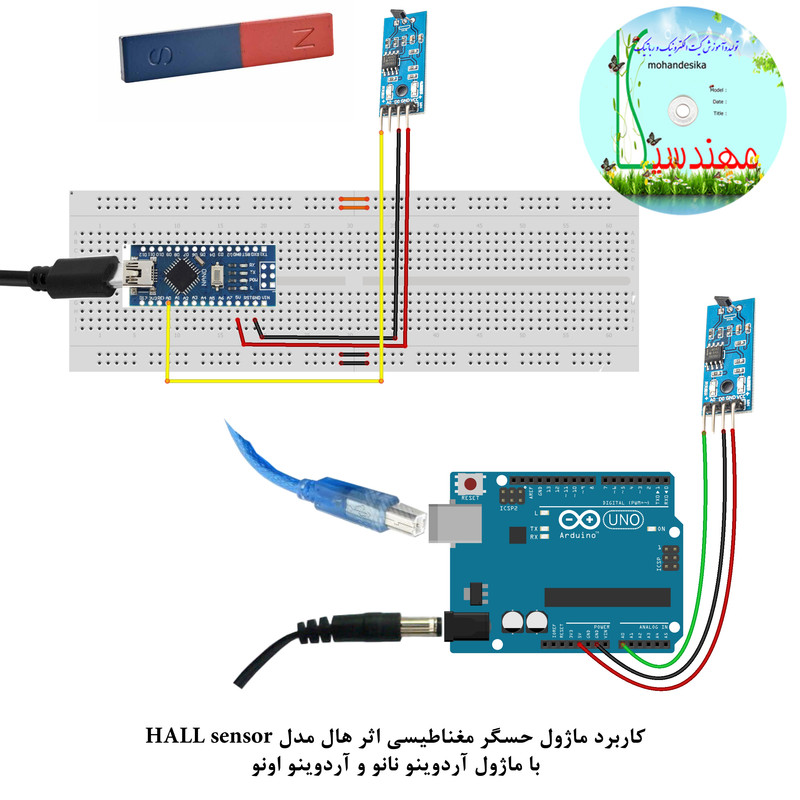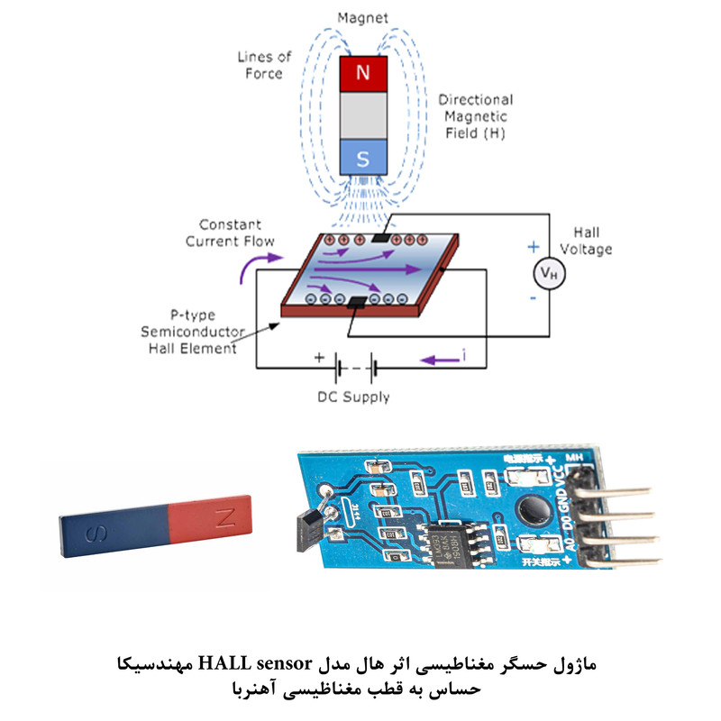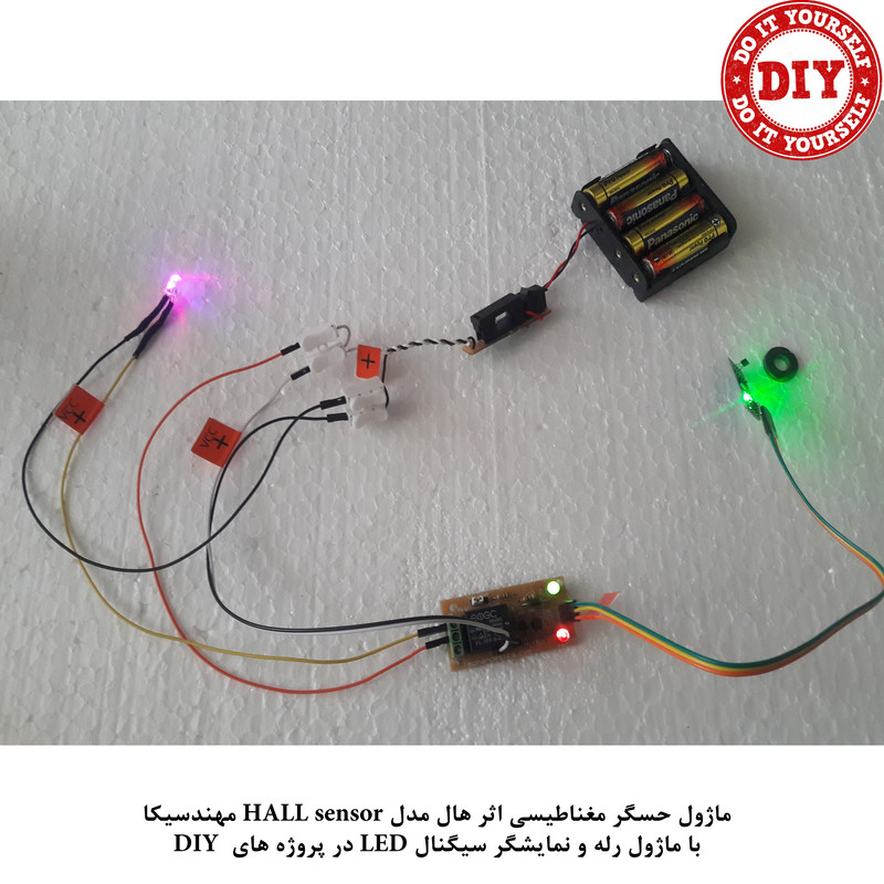 کیت ساده آموزشی سرگرمی مهندسیکا جهت آشنایی با راه اندازی ماژولهای الکترونیکی است که نیازی به لحیم کاری و تجهیزات خاصی ندارد شما میتوانید با استفاده از یک باتری 5 ولت به سادگی عملکرد ماژول را ببینید. سنسور اثر هال مبدلی است که خروجی آن بصورت ولتاژی است که در پاسخ به میدان مغناطیسی تغییر می کند. ولتاژ هال متناسب است با جریان الکتریکی (I) و میدان مغناطیسی (B).اندازه این ولتاژ در محدوده میکرو ولت می باشد. به همین خاطر در کاربردهای عملی حضور تقویت کننده ها ضروری می باشد.با اعمال میدان های مغناطیسی نسبتا بزرگ ولتاژ خروجی در محدوده چند میکروولت می باشد. در این ماژول برای ارتقا حساسیت سنسور و گرفتن خروجی مطلوب با بیشترین دقت و با حداقل خطای هیسترزیس از تقویت کننده، رگولاتور ولتاژ و مدارهای سوییچینگ منطقی استفاده شده است که راه اندازی آسان آن را توسط آردوینو میسر می سازد.اثر هال یک اثر الکترومغناطیسی است که توسط Edwin Hall در سال 1879 کشف شد. طبق این اثر اگر یک هادی در میدان مغناطیسی قرار گیرد ، از طرف میدان مغناطیسی نیرویی وارد بر الکترون های آن هادی می شود که موجب حرکت آن ها و بوجود آمدن اختلاف پتانسیل - ولتاژ- می گردد.سنسور اثر هال مدل 3144 یک سنسور اثر هال چهارپایه مطابق شکل است اگر هیچ میدانی وجود نداشته باشد ، خروجی دیجیتال سنسور Low می شود و در صورت وجود میدان مغناطیسی قوی اطراف سنسور خروجی آن High می شود. یک LED نیز روی برد قرار دارد که در صورت High شدن ، روشن می گردد.در این کیت خروجی ماژول با عث تحریک ماژول رله مهندسیکا میگردد. با فرمان به پایه IN ماژول رله میتوان خروجی رله را فعال نمود از آنجا که خروجی رله دو حالت باز (NO) و بسته (NC) دارد شما متناسب با نیازتان میتوانید بکار ببرید . این کیت کاربرد آموزشی و سرگرمی دارد .شما میتوانید از این ماژول در مدارات میکروکنترلری همانند ماژلهای آردوینو استفاده نمایید. در این آموزش هدف آشنایی شما با ماژولهای الکترونیکی بصورت اولیه و سریع بدون صرف وقت و هزینه بالا است لذا جهت کاربردهای حرفه ای تر شما میتوانید با برنامه نویسی مدارات میکروکنترلری مانند آردوینو با نرم افزار IDE از تمام قابلیهای کنترلی این ماژول در هوشمند سازی و اتوماسیون استفاده کنید.جهت راه اندازی کیت نیازمند باتری 5 ولتی هستید. کیت بدون باتری تحویل میشود .