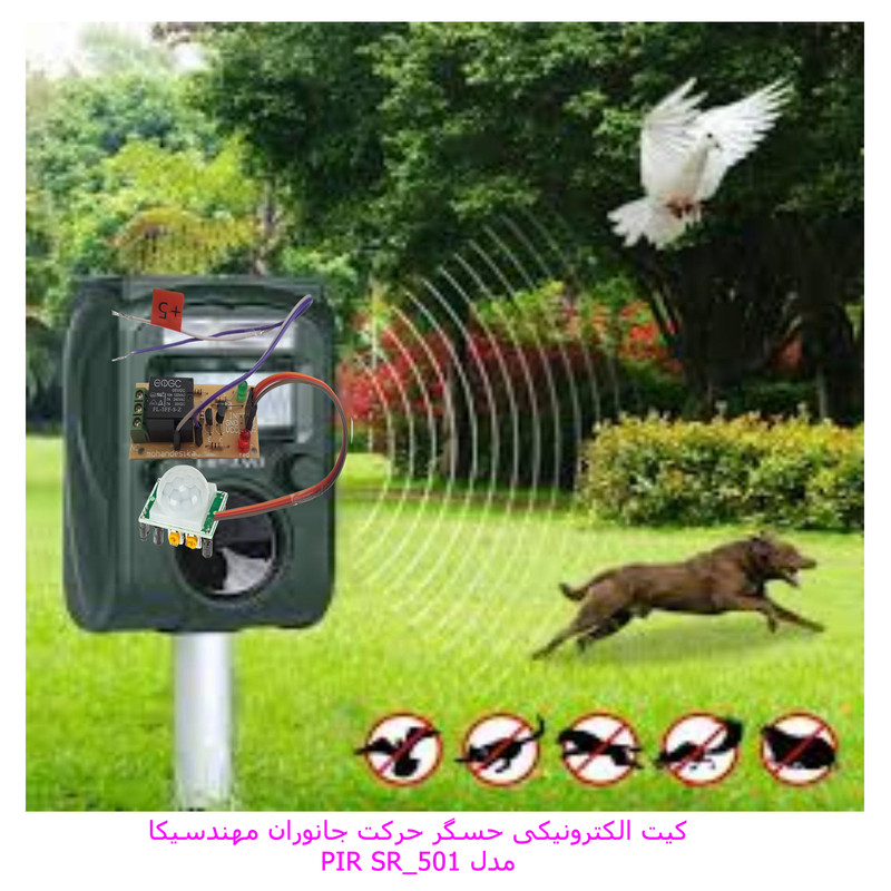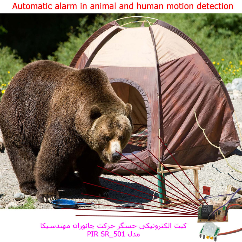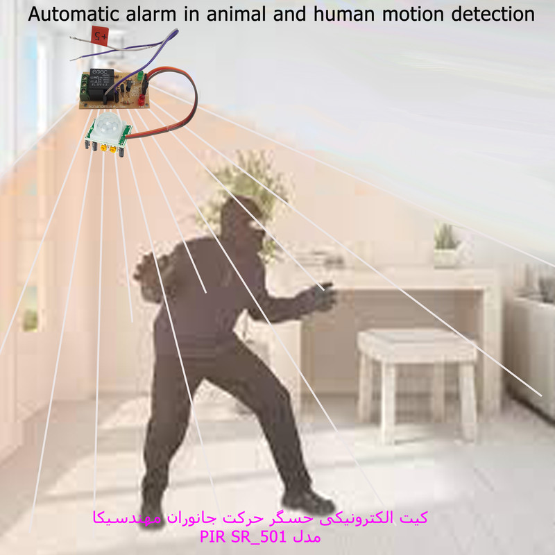 حسگر حرکت ساده ترین مدل کیت دزدگیر مهندسیکا با قابلیت تنظیم محدود زمان وصل بودن سنسورتشخیص حرکت مادون قرمز است که بسیار ساده و کاربردی به همراه رله 5 ولت تک کاناله مهندسیکا ارائه شده است .که به سادگی میتوانید خروجی رله به مدارات آلارم متصل کنید.کاربردهای متنوع کیت مهندسیکا شامل :1- تشخیص حرکت بعنوان دزدگیر منزل.2- حسگر چراق روشنایی راه پله طبقات.2- تشخیص حرکت جانوران در اطراف چادر کمپ یا محیطهای فضای باز.4- تشخیص حرکت پرندگان جهت دور کردن از مزارع کشاورزی.5- تشخیص حرکت حیوانات و فعال کردن سیستم هشدار یا دفع حیوانات.حسگرهای مادون قرمز (PIR sensor) نوعی از حسگرها هستند که به تابش مادون قرمز حساسند. این حسگرها اغلب برای تشخیص تابش مادون قرمز حاصل از بدن موجودات زنده اعم از انسان ، حیوانات ، و حرکتشان، در آشکارسازهای حرکت کاربرد دارند..استفاده از این سنسور ها در سیستم های امنیتی برای تشخیص حرکت انسان و یا ورود های غیر مجاز بسیار رایج می باشد. راه اندازی اولیه و کالیبره شدن این سنسورها چیزی در حدود 60 تا 90 ثانیه به طول می انجامد و در طی این مدت برای تنظیم دقیق نباید در شعاع دید آنها حرکتی انجام پذیرد( جهت سنسور به سمت دیگر باشد ). خروجی سنسور تشخیص حركت مستقیما به یکی از پایه های ورودی تحریک رله متصل می گردد و در صورتی که هر نوع حرکتی توسط این سنسور تشخیص داده شود مقدار این پین یک می گردد و رله متناسب با زمان تنظیم شده روشن میشود. تا زمانی که حرکت مقابل سنسور وجود داشته باشد رله روشن می ماند و بعد از طی شدن زمان تنظیم شده اگر حرکتی نباشد خاموش میشود .از آنجا که این محصول کاربرد آموزشی دارد لذا قطعات بصورت نمونه آزمایشگاهی ارائه شده است. این کیت وقتی عملکرد صحیح دارد که ولتاژ ولت باتری کامل باشد در صورت لزوم از آداپتور 5 ولت استاندارد استفاده کنید دقت کنید در محیط های شلوغ و پرتردد سنسور وصل است.دو پتانسیومتر بر روی سنسور قرار دارد مطابق شکل یکی برای تنظیم حساسیت سنسور و دیگری برای تنظیم زمان وصل ماندن سنسور است.جهت تنظیم زمان وصل بودن سنسور پس از تشخیص حرکت مطابق شکل پتانسیومتر زرد رنگ سمت چپ را اگر در سمت عقربه های ساعت بچرخانیم زمان بیشتر میشود و بلعکس.