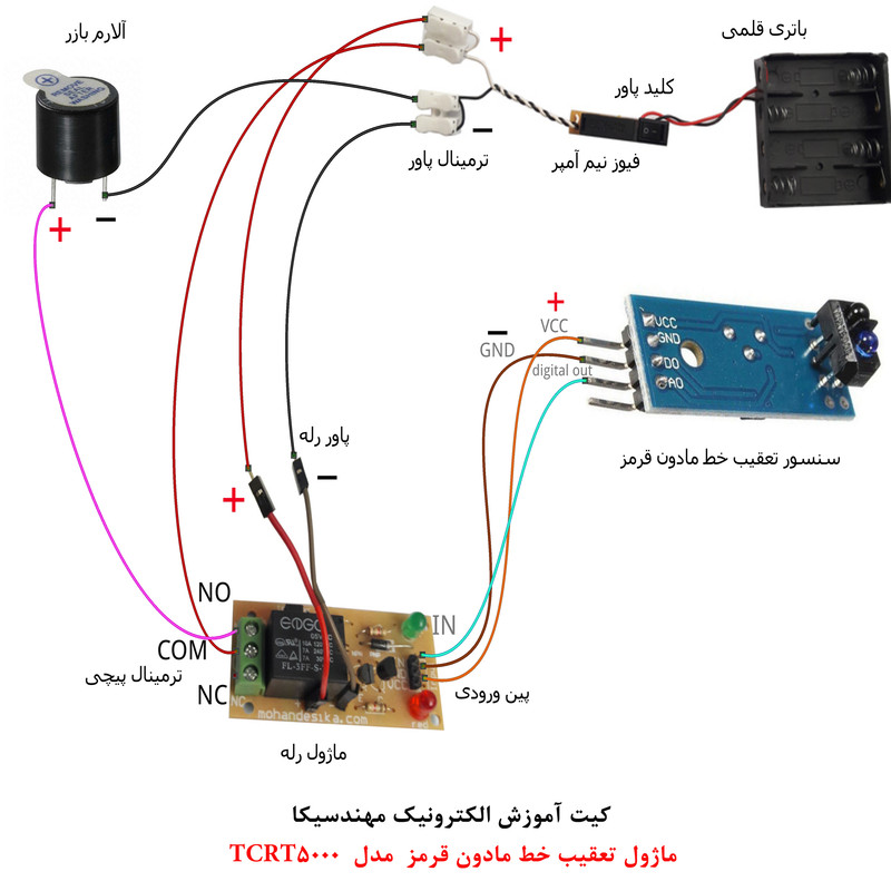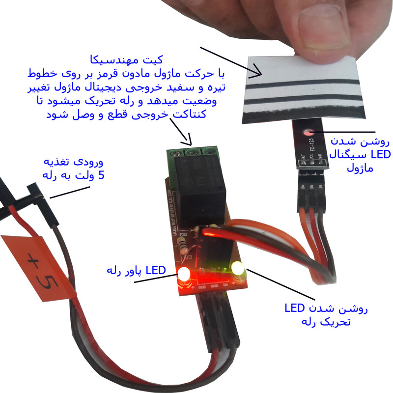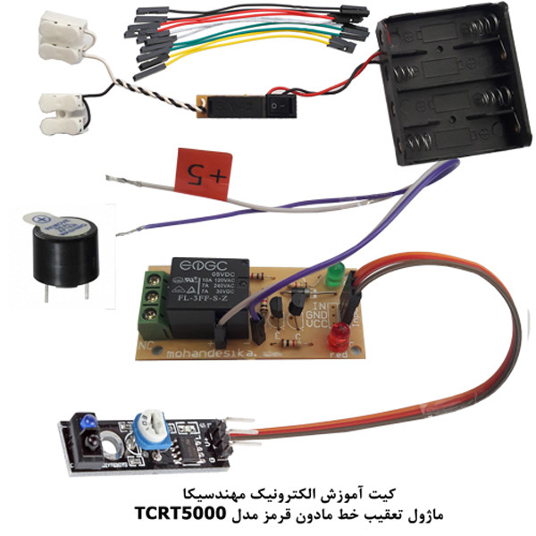 کیت آموزش الکترونیک دانش آموزی مهندسیکا یک کیت ساده سرگرمی،آموزشی است که دانش آموزان و نوجوانان را با ماژولها و مدارات الکترونیک و کنترلی آشنا میکند در این کیت هدف آشنایی و اجرای پروژهای کاربردی الکترونیکی بدون نیاز به لحیم کاری یا برنامه نویسی است .جهت انجام یک کار پژوهشی علمی و سرگرم کننده برای دانش آموزان است. ماژولهای لازم به صورت نمونه آزمایشگاهی به همراه فیلم آموزش جهت علاقه مندان ارائه میگردد که علاوه بر سرگرمی و لذت بردن از مدارات الکترونیک کاربرد آموزشی نیز دارد.این ماژول دارای سنسور فرستنده و گیرنده مادون قرمز TCRT5000 در یک بسته بندی می باشد و میتواند خطوط سفید و سیاه را تشخیص دهد. از این قابلیت در ربات های مسیریاب جهت ردگیری و تعقیب خط استفاده می شود. فرستنده مادون قرمز همواره روشن است و سیگنال ارسال می کند. اگر این سیگنال به سطح سفید برخورد کند ، منعکس شده و گیرنده مادون قرمز آن را جذب می کند و پایه S در این حالت Low می گردد. اما اگر سیگنال به سطح مشکی برخورد کند ، بازتابش صورت نمی گیرد و سطح پایه S در این حالت High می گردد .با استفاده از برنامه نویسی ماژول آردوینو به سادگی میتوان عملکرد ماژول را مشاهده نمود وقتی یک صفحه سفید مقابل سنسور قرار می دهیم خروجی مانیتور صفر شده و LED روی ماژول روشن میگردد و در مقابل صفحه سیاه بلعکس . با استفاده از ماژول رله تغییرات سیگنال سنسور بصورت آلارم بازر در خروجی ماژول رله قابل مشاهده است . توجه داشته باشید قطعات بصورت مجزا ارائه میشود و خریدار میتواند با استفاده از فایل آموزشی ارائه شده ، قطعات و ماژولها را مونتاژ نماید لذا ارائه تصویر وعکس کیت مونتاژ شده در فروشگاه جهت راهنمایی خریداران است مونتاژ بصورت آزمایشگاهی مزایای زیادی برای کاربران دارد که در بردهای مدارچاپی امکان ندارد از جمله بازگشت و اصلاح مدار ویا استفاده از قطعات یا ماژولها در سایر طرحها و همچنین امکان مونتاژ و دمونتاژ مدار به دفعات، برای علاقه مندان این روش که بصورت آزمایشگاهی مدارات مونتاژ میشوند بهترین روش آموزشی در یادگیری است.این بسته به همراه DVD، آموزش مونتاژ مدار ارائه میگردد.جهت راه اندازی کیت چهار عدد باتری قلمی یک و نیم ولت استاندارد تهیه شود .کیت کاربرد سرگرمی آموزشی دارد .