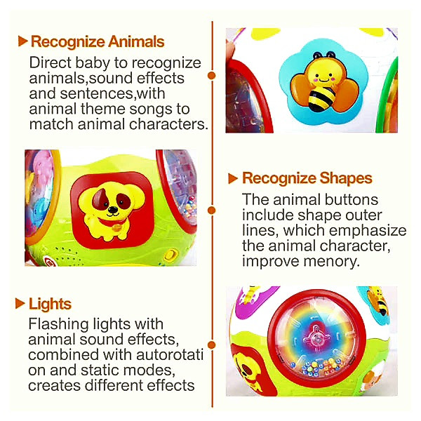 توپ شاد هولي تويز، یک اسباب بازی با کابردهای متنوع است، به طوری که در این توپ از رنگهای شاد جهت جذب کودک، موسیقیهای کودکانه و اشکال مختلف حیوانات استفاده شده است. این توپ در دو حالت حرکت چرخشی با تغییر مرکز ثقل و بدون تحرک قابل استفاده است که لحظات سرگرم کنندهای را برای کودک شما فراهم میآورد.در صورت استفاده از این اسباب بازی کودک قادر خواهد بود تا انواع مختلف حیوانات و رنگها را بشناسد و ضمن سرگرم شدن و بازی تحت آموزش نیز قرار بگیرد. توپ شاد هولي تويز، یک توپ موزیکال است که برای کودکان بالای 6 ماه طراحی شده است، این توپ در حالت حرکت چرخشی با تغییر مرکز ثقل میچرخد، موزیک پخش میکند و چراغهایی به صورت چمک زن روشن میشوند که باعث هیجان و لذت کودک میشود.