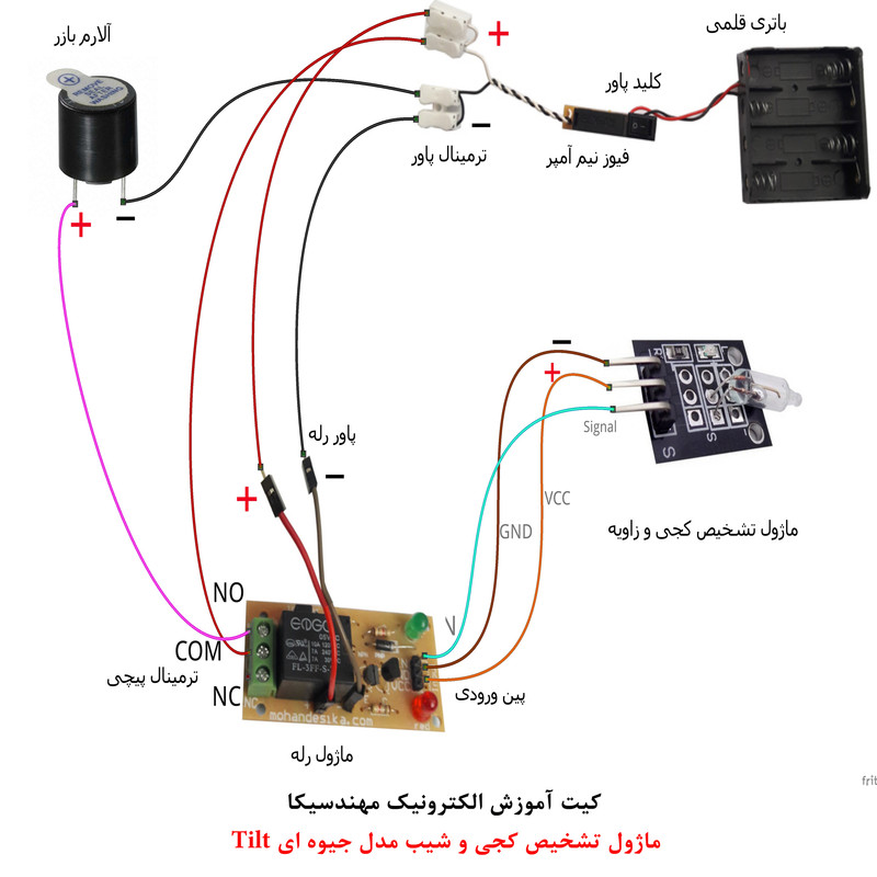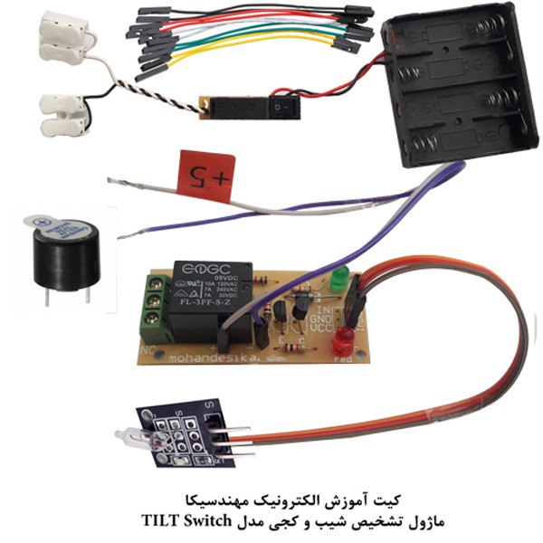 کیت آموزش الکترونیک دانش آموزی مهندسیکا یک کیت ساده سرگرمی،آموزشی است که دانش آموزان و نوجوانان را با ماژولها و مدارات الکترونیک و کنترلی آشنا میکند در این کیت هدف آشنایی و اجرای پروژهای کاربردی الکترونیکی بدون نیاز به لحیم کاری یا برنامه نویسی است .جهت انجام یک کار پژوهشی علمی و سرگرم کننده برای دانش آموزان است. ماژولهای لازم به صورت نمونه آزمایشگاهی به همراه فیلم آموزش جهت علاقه مندان ارائه میگردد که علاوه بر سرگرمی و لذت بردن از مدارات الکترونیک کاربرد آموزشی نیز دارد.ماژول تشخیص کجی و شیب(تیلت) یک ماژول سوئیچ جیوه الکترونیکی است که شامل یک کنتاکت تماس با مدار بسته برای شناسایی جریان الکتریکی است. این ماژول معمولاً برای تشخیص جهت حرکت، شیب، لرزش و یا تحریک مکانیکی در سیستم های الکترونیکی کاربرد دارد. در این کیت میتوانید با تحریک سنسور نتیجه را در خروجی ماژول رله با صدای آلارم بازر مشاهده نمایید و با عملکرد ماژولها آشنا شوید .این ماژول در پروژه های الکترونیکی و رباتیک بخصوص هوشمندسازی کاربرد دارد .این سوئیچ دارای یک استوانه است که در انتهای آن دو کنتاکت فلزی قرار دارند. در داخل لوله، یک قطره جیوه قرار دارد که در صورتی که استوانه به اندازه کافی کج شود، قطره جیوه بر روی کناتکت ها قرار گرفته و کلید وصل می شود .(توجه : جیوه داخل حباب شیشه ای ماده سمی است رعایت نکات ایمنی را داشته باشید) .توجه داشته باشید قطعات بصورت مجزا ارائه میشود و خریدار میتواند با استفاده از فایل آموزشی ارائه شده ، قطعات و ماژولها را مونتاژ نماید لذا ارائه تصویر وعکس کیت مونتاژ شده در فروشگاه جهت راهنمایی خریداران است مونتاژ بصورت آزمایشگاهی مزایای زیادی برای کاربران دارد که در بردهای مدارچاپی امکان ندارد از جمله بازگشت و اصلاح مدار ویا استفاده از قطعات یا ماژولها در سایر طرحها و همچنین امکان مونتاژ و دمونتاژ مدار به دفعات، برای علاقه مندان این روش که بصورت آزمایشگاهی مدارات مونتاژ میشوند بهترین روش آموزشی در یادگیری است.این بسته به همراه DVD، آموزش مونتاژ مدار ارائه میگردد.جهت راه اندازی کیت چهار عدد باتری قلمی یک و نیم ولت استاندارد تهیه شود .کیت کاربرد سرگرمی آموزشی دارد .