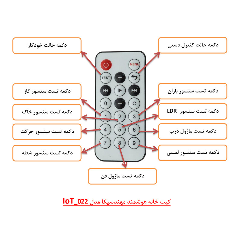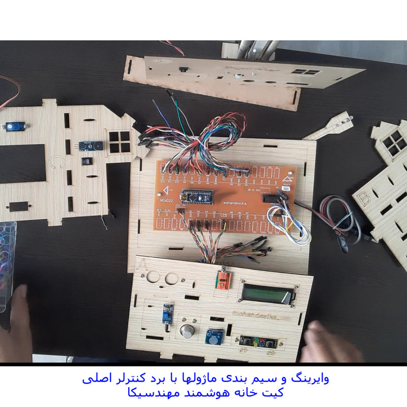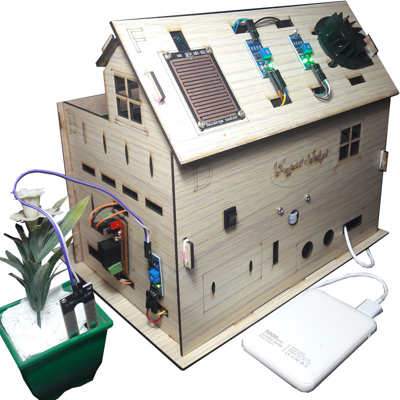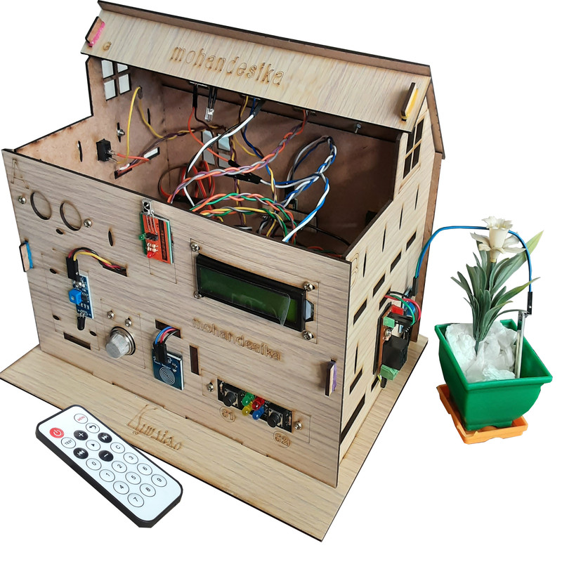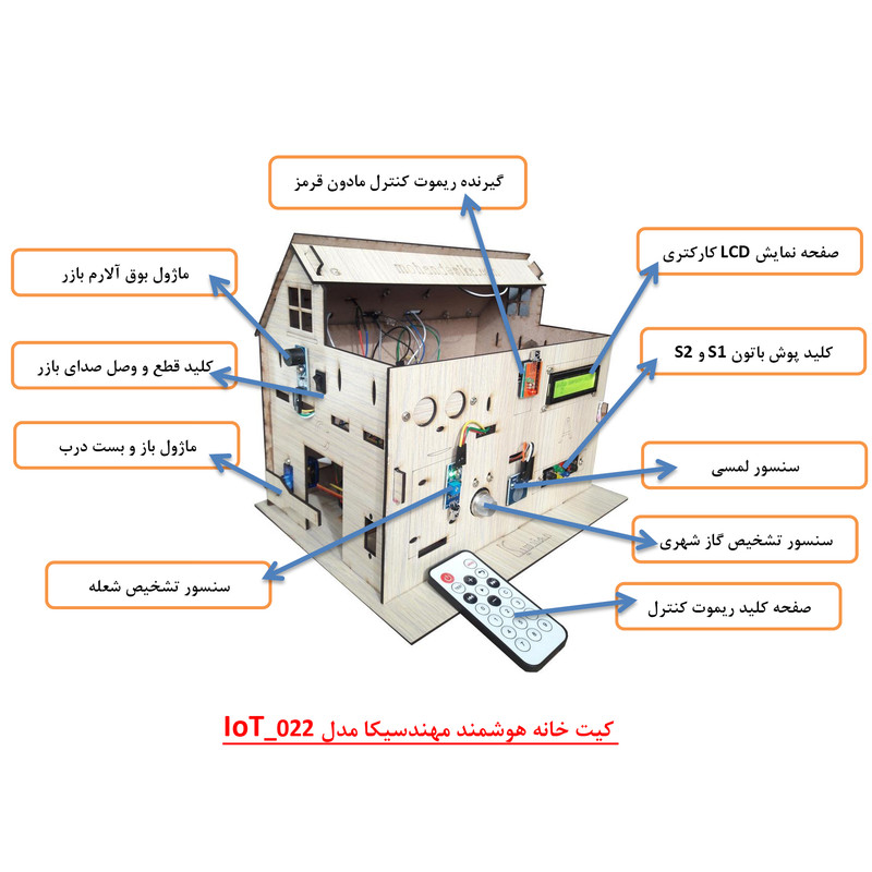 کیت خانه هوشمند مهندسیکا مدل IoT home-022 مجموعه ای آموزنده و سرگرم کننده برای آشنایی عملکرد ماژولهای الکترونیکی در هوشمند سازی منازل و ساختمان ها بصورت ماژولار است .کنترل درب پارکینگ با رمز ورود و حسگر روشنایی، کنترل رطوبت خاک گل و باغچه ، کنترل روشن و خاموش کردن لامپ روشنایی با حسگر نوری و لمسی، کنترل فن تهویه با رله، کنترل تردد و حضور افراد با حسگر مادون قرمز، هشدار آتش سوزی با حسگر شعله و آتش ، هشدار خطر انفجار با حسگر نشت گاز و حسگر تشخیص باران از قابلیهای کیت است که بصورت یک محصول آموزشی سرگرمی در اختیار شماست . بدون نیاز به لحیم کاری و برنامه نویسی بصورت ماژولار کیت قابل راه اندازی است.کنترل سنسورها توسط صفحه کلید ریموت کنترل مادون قرمز از فاصله دور است که در دو حالت کنترل دستی و کنترل خودکار میتوانید کیت را فعال کنید . تمام وضعیت های سنسورها بر روی نمایشگر LCD کاراکتری قابل مشاهده است و با صدای آلارم بازر، هشدار لازم داده میشود . ماکت چوبی خانه هوشمند از جنس فیبر MDF است که صفحات با قرارگرفتن داخل شیار مربوطه طبق راهنمای فایل آموزشی مونتاژ میگردند.کیت کاربرد آموزشی دارد و به سادگی میتوانید عملکرد سنسورهای هوشمند را بر روی کیت مشاهده نمایید. مجموعه سنسورها و ماژولهای کیت با میکروکنترلر آردوینو نانو مدل ATmega 328 برنامه نویسی شده است مشخصات ماژولها و نحوه راه اندازی سنسورها در فایل راهنما ،آموزش داده میشود. سورس کد نرم افزار آردوینو نانو در اختیار شما قرا دارد تا با نحوه کنترل و برنامه نویسی کدها آشنا شوید . میکروکنترلر پروگرم شده است. سنسورها بر روی ماکت کیت خانه چوبی با پیچ و مهره نصب میگردند و شکل ماکت، حس هوشمندسازی فضای ساختمان را برایتان ایجاد خواهد نمود . مجموعه بصورت ماژولاردر اختیار شماست وشما میتوانید طبق راهنمای فایل آموزشی اجزای کیت را مونتاژ کنید. کیت به همراه پاور بانک 5 ولتDC با رابط USB بعنوان منبع تغذیه، باتری کتابی 9 ولت و حافظه فلش USB فایل و فیلمهای آموزشی در اختیار شما قرار میگیرد. تمام مراحل آموزش علاوه بر فایل راهنمای متن الکترونیکی بصورت فیلمهای ویدئویی نیز ارائه میشود و شما میتوانید به سادگی اجزای کیت را مونتاژ و راه اندازی کنید کاربرد کیت جهت پروژه های دانش آموزی ، دانشجویی وسایر علاقه مندان به دانش هوشمندسازی الکترونیکی است