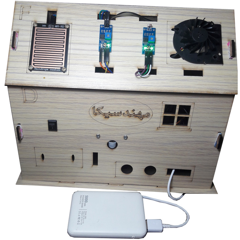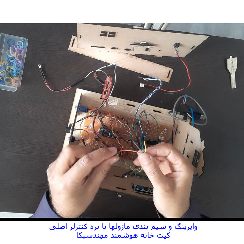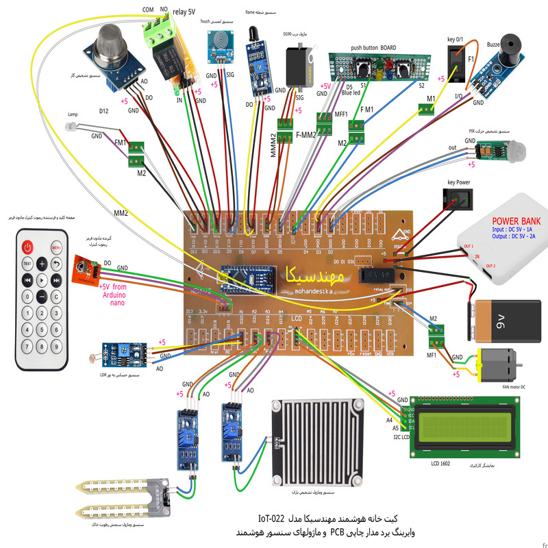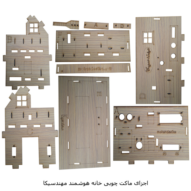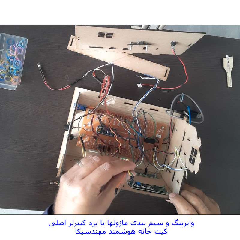 کیت خانه هوشمند مهندسیکا مدل IoT home-022 مجموعه ای آموزنده و سرگرم کننده برای آشنایی عملکرد ماژولهای الکترونیکی در هوشمند سازی منازل و ساختمان ها بصورت ماژولار است .کنترل درب پارکینگ با رمز ورود و حسگر روشنایی، کنترل رطوبت خاک گل و باغچه ، کنترل روشن و خاموش کردن لامپ روشنایی با حسگر نوری و لمسی، کنترل فن تهویه با رله، کنترل تردد و حضور افراد با حسگر مادون قرمز، هشدار آتش سوزی با حسگر شعله و آتش ، هشدار خطر انفجار با حسگر نشت گاز و حسگر تشخیص باران از قابلیهای کیت است که بصورت یک محصول آموزشی سرگرمی در اختیار شماست . بدون نیاز به لحیم کاری و برنامه نویسی بصورت ماژولار کیت قابل راه اندازی است.کنترل سنسورها توسط صفحه کلید ریموت کنترل مادون قرمز از فاصله دور است که در دو حالت کنترل دستی و کنترل خودکار میتوانید کیت را فعال کنید . تمام وضعیت های سنسورها بر روی نمایشگر LCD کاراکتری قابل مشاهده است و با صدای آلارم بازر، هشدار لازم داده میشود . ماکت چوبی خانه هوشمند از جنس فیبر MDF است که صفحات با قرارگرفتن داخل شیار مربوطه طبق راهنمای فایل آموزشی مونتاژ میگردند.کیت کاربرد آموزشی دارد و به سادگی میتوانید عملکرد سنسورهای هوشمند را بر روی کیت مشاهده نمایید. مجموعه سنسورها و ماژولهای کیت با میکروکنترلر آردوینو نانو مدل ATmega 328 برنامه نویسی شده است مشخصات ماژولها و نحوه راه اندازی سنسورها در فایل راهنما ،آموزش داده میشود. سورس کد نرم افزار آردوینو نانو در اختیار شما قرا دارد تا با نحوه کنترل و برنامه نویسی کدها آشنا شوید . میکروکنترلر پروگرم شده است. سنسورها بر روی ماکت کیت خانه چوبی با پیچ و مهره نصب میگردند و شکل ماکت، حس هوشمندسازی فضای ساختمان را برایتان ایجاد خواهد نمود . مجموعه بصورت ماژولاردر اختیار شماست وشما میتوانید طبق راهنمای فایل آموزشی اجزای کیت را مونتاژ کنید. کیت به همراه پاور بانک 5 ولتDC با رابط USB بعنوان منبع تغذیه، باتری کتابی 9 ولت و حافظه فلش USB فایل و فیلمهای آموزشی در اختیار شما قرار میگیرد. تمام مراحل آموزش علاوه بر فایل راهنمای متن الکترونیکی بصورت فیلمهای ویدئویی نیز ارائه میشود و شما میتوانید به سادگی اجزای کیت را مونتاژ و راه اندازی کنید کاربرد کیت جهت پروژه های دانش آموزی ، دانشجویی وسایر علاقه مندان به دانش هوشمندسازی الکترونیکی است