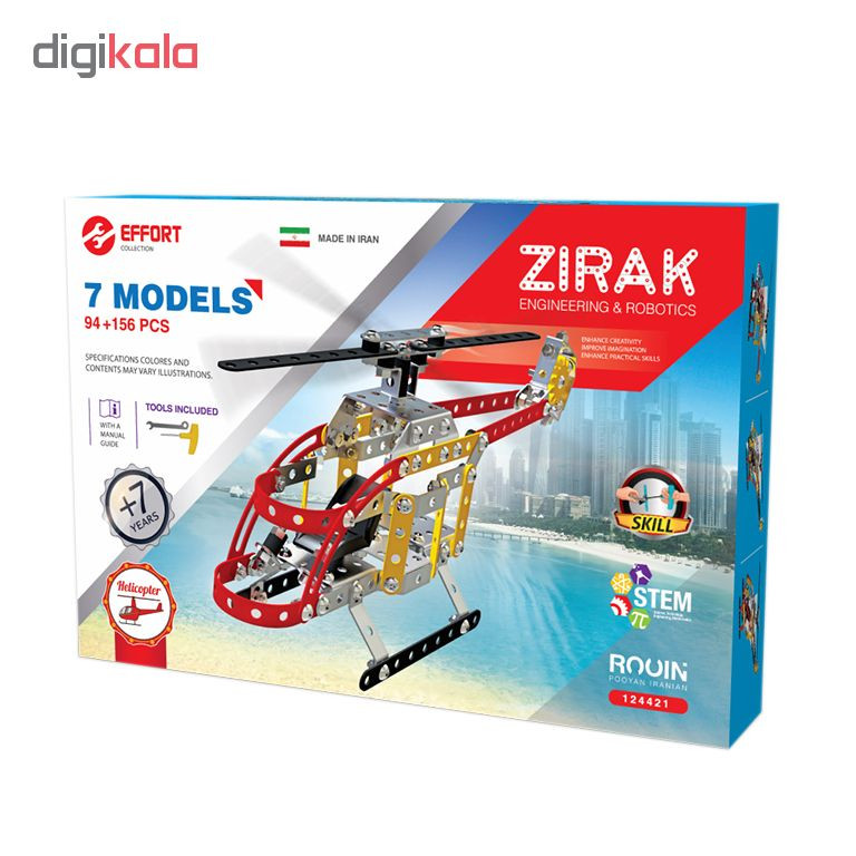 محصول ساختنی های فلزی 7 مدل بالگرد زیرک از جمله محصولات منحصر به فرد با قطعات بسیار متنوع می باشد که برای کودکان بسیار سرگرم کننده و مفرح است و علاوه بر سرگرمی برای تقویت حافظه و بالا رفتن خلاقیت کودکان بسیار مفید است. در این مجموعه امکان ساخت 7 مدل جذاب بالگرد به کمک دفترچه راهنما و با استفاده از ابزار موجود در بسته وجود دارد .
