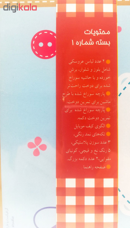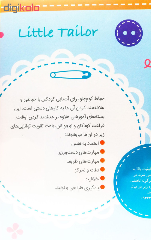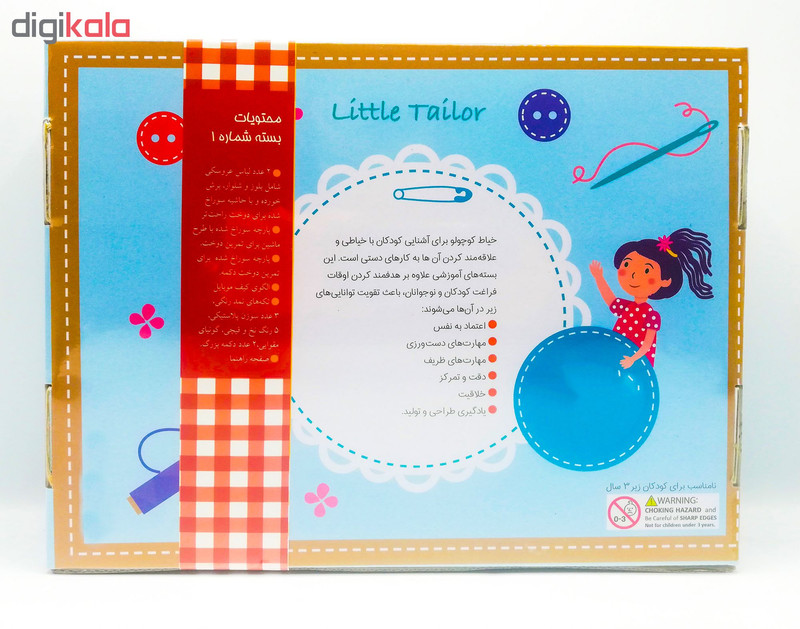 پکیج های اموزشی خیاط کوچولو با هدف تقویت و ارتقاء مهارت های ذهنی و جسمی کودکان و افزایش قدرت تمرکز و دقت ،طراحی و تولید گردیده است که شامل ۳ بسته اموزشی میباشد. همچنین این محصولات باعث اشنایی اولیه کودکان با خیاطی و گلدوزی و ابزار مورد نیاز و طرح های سنتی می گردد ، پکیج خیاط کوچولو ۱ :مخصوص نوآموزان بالای ۴ سال تا ۱۰ سال .شامل صفحه خلاقیت.۳ عدد لباس عروسکی با حاشیه های سوراخ شده،الگو و پارچه،صفحه دکمه دوز،قیچی،۳ عدد سوزن،۵ رنگ نخ،اشل و راهنمای کامل میباشد.کار با این بسته علاوه بر مزایای فوق الذکر باعث افزایش اعتماد بنفس با انجام کارهایی مشابه بزرگسالان میشود
