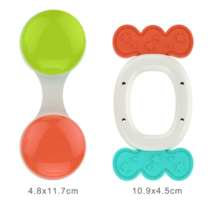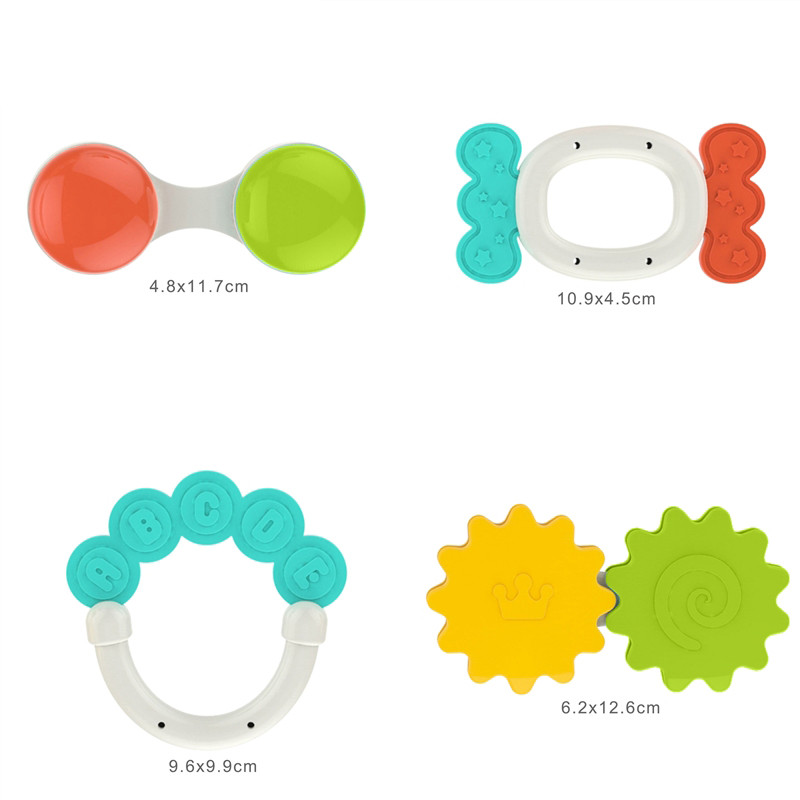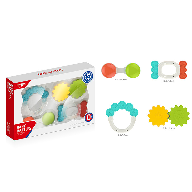 پکیج جغجغه و دندانگیر 4 عددی (HE0152) هانگر HUANGER مناسب برای نوزادان از بدو تولد می باشد و این پکیج شامل 4 عدد جغجغه و دندانگیر می باشد (اشکال و رنگ ها مطابق عکس) که با تولید صداهای ملایم و جذاب جغجغه ای کودک را تشویق به بازی مجدد می کند این پکیج دارای برجستگی های استاندارد جهت رفع خارش لثه کودک است.