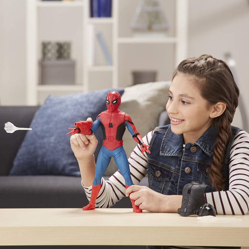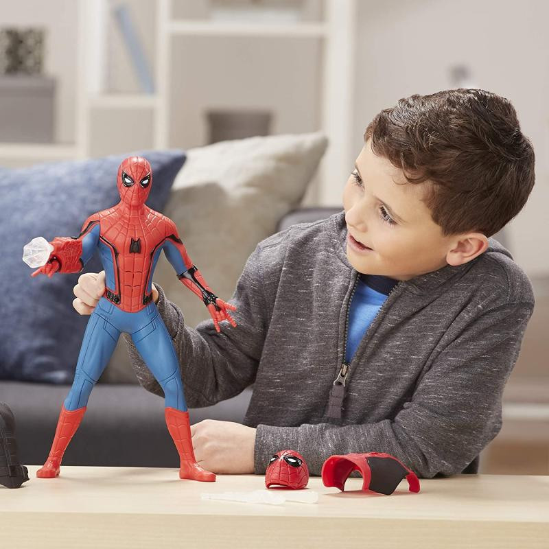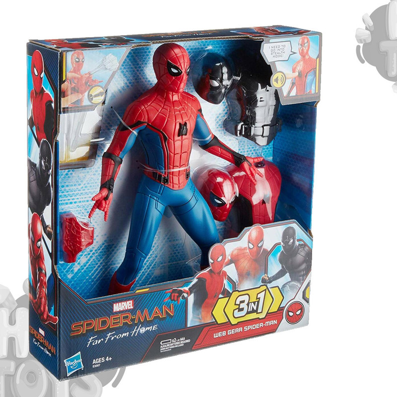 اکشن فیگور اسپایدرمن دور از خانه شامل یک فیگور اسباب بازی مرد عنکبوتی است که محصول برند هاسبرو می باشد که یک تولید کننده اسباب بازی مشهور در دنیا است. این اسباب بازی از جنس پلاستیک بسیار با کیفیت است که از مواد اولیه درجه یک تولید شده است. این فیگور با دقت بسیار زیادی طراحی شده است و کیفیت بسیار خوبی دارد. این فیگور ارتفاع 32 سانتی متری دارد و برای کودکان سه سال به بالا طراحی شده است و می تواند اسباب بازی عالی برای بازی کودکان باشد. پسران علاقه خاصی به این اکشن فیگور دارند. در این مجموعه علاوه بر فیگور دو دست لباس نیم تنه و دو ماسک در رنگ های سیاه و قرمز و سه تار با دستگاه پرتاب تار وجود دارد. وسیله پرتاب تار بروی دست فیگور قرار می گیرد که با قرار دادن تار و فشار دادن کلید روی دستگاه تار پرتاب می شود. بروی این فیگور می توان لباس نیم تنه را بروی تن عروسک کرد و یا ماسک را بروی صورت اسپایدرمن قرار داد. این باعث تغییر ظاهر اکشن فیگور می باشد که سه حالت را می توان بروی فیگور اعمال کرد. از ویژگی های این اسباب بازی پسرانه دکمه روی سینه عروسک می باشد که با فشار دادن آن اسپایدرمن شروع به سخن گفتن می کند. این ویژگی های برای کودکان بسیار جذاب هستند. تمام آن مجموعه درون یک بسته بندی جعبه ای باز قرار دارد که می توان آن را در درون جعبه بخوبی مشاهده کرد. اسباب بازی با دو باتری نیم قلم AAA انرژی می گیرد که در پشت عروسک قرار می گیرد.