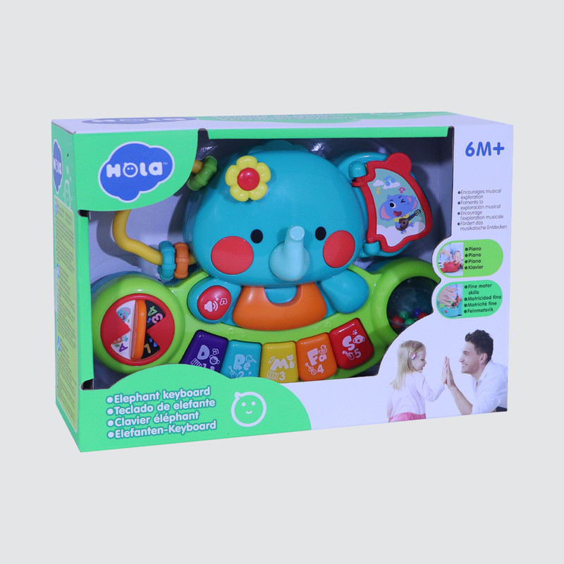 شرکت هولا (hola) سازنده انواع اسباب بازی های موزیکال و... میباشد که مناسب کودکان زیر 3 سال طراحی شده است. در ساخت محصولات از هیچگونه مواد شیمیایی استفاده نشده است و مقاومت بسیار خوبی در برابر ضربات نشان میدهد. در ساخت اسباب بازی ها از رنگ بندی های شاد استفاده شده است تا کودکان به خوبی با آن ارتباط بر قرار کنند و هنگامی که جغجغه را داخل دهان میگذارند باعث ایجاد حساسیت نشود. دماغ فیل همانند یک اهرم چرخش 360 درجه قابلیت چرخش دارد تا نوزادان بتوانند با آن بازی کنند، دکمه های پایین جغجغه قابلیت پخش موسیقی های شاد و کودکانه را دارد.