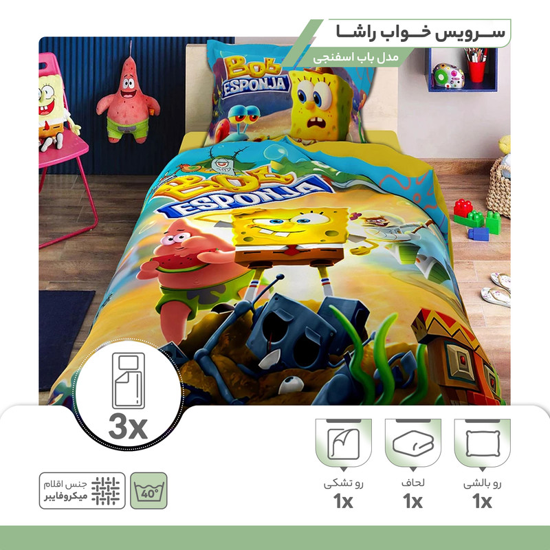 سرویس خواب راشا مدل باب اسفنجی یک نفره 3 تکه